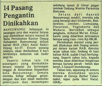 Sebanyak 14 pasangan pria dan wanita Selasa pagi dinikahkan secara massal di Balai Pernikahan Kantor Depag Kabupaten Banyuwangi dalam kaitan HAB (Hari Amal Bakti) Depag ke-37. Enama pasang sisanya, akan dinikahkan 6 hari berikutnya lantaran tak hadir pagi itu.