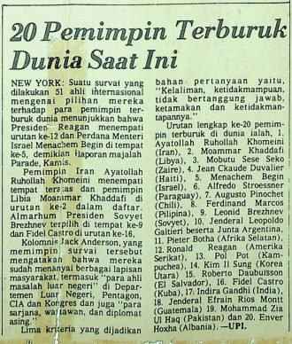 Sebuah survei yang dilakukan 51 ahli internasional mengenai pilihan mereka terhadapa para pemimpin terburuk menunjukkan bahwa Presiden Reagan menempati urutan ke-12 dan Perdana Menteri Israel Menachem Begin di tempat ke-5.