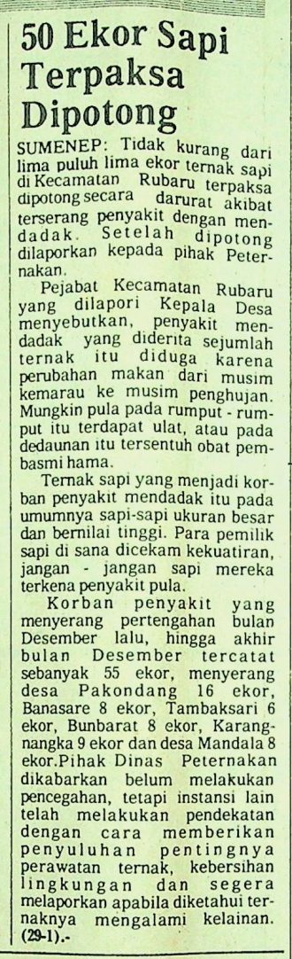 Tidak kurang dari lima puluh lima ekor ternak sapi di Kecamatan Rubaru terpaksa dipotong secara darurat akibat terserang penyakit secara mendadak.