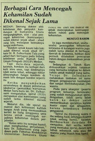 Dr. H. Zulkarnain Tala, dokter spesialis kebidanan dan kandungan di RSUP Pirngadi Medan, menyatakan bahwa alat kontrasepsi sudah dikenal sejak berabad-abad lalu, meskipun bentuknya masih sederhana. Ia menambahkan bahwa kondom untuk pria telah digunakan sejak abad ke-18.