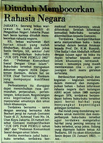 Seorang bekas wartawan Harian Abadi diadili di Pengadilan Negeri Jakarta Pusat karena dituduh membocorkan rahasi negara oleh jaksa Susilo Oeripto, SH., karena sekitar Juni 1981 mengedarkan buku-buku “JUK OPS PAM PEMILU 1982” dan “Pedoman Komunikasi Sosial Dengan Umat Islam” buku tersebut merupakan dokumen negara milik Departemen Hankam, dalam hal ini STER (Staf Teritorial) Hankam yang mempunyai kualifikasi rahasia.