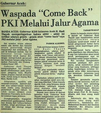 Guberbur KDH Istimewa Aceh H. Hadi Thayeb memperingatkan bahwa akhir-akhir ini terlihat adanya gejala-gejala akan “come back”-nya PKI melalui jalur-jalur agama. Hal tersebut terasa adanya sistem adu domba dan hasutan antara pemerintah dengan masyarakat dan sebaliknya terjadi di beberapa daerah