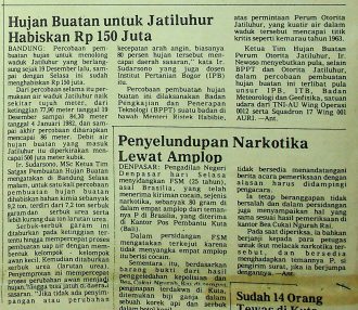 Percobaan pembuatan hujan untuk menolong waduk Jatiluhur yang dimulai sejak 19 Desember 1983 dihitung telah menghabiskan sekitar Rp 150 juta. Hasilnya, permukaan air waduk Jatiluhur naik sekitar tujuh meter dari ketinggian 77,90 meter menjadi 84,30 meter.