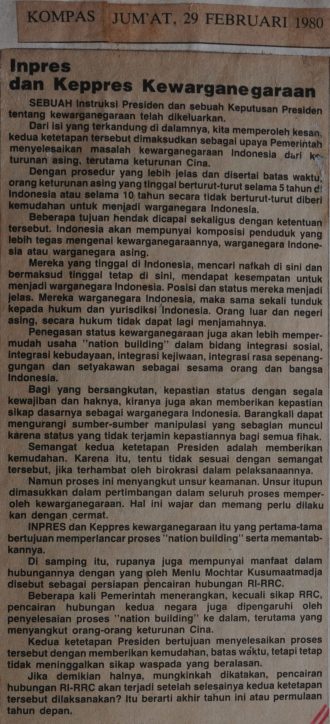 Sebuah Inpres dan Keppres tentang kewarganegaraan telah dikeluarkan. Dari isi yang terkandung di dalamnya, kedua ketetapan tersebut dimaksudkan sebagai upaya pemerintah dalam menyelesaikan masalahan kewarganegaraan Indonesia dari keturunan asing, terutama keturunan Cina.