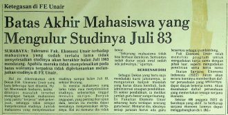 Fakultas Ekonomi Unair dengan tegas manyatakan bahwa mahasiswa yang belum menyelesaikan studinya sampai bulan Juli 1983 tidak lagi diperbolehkan melanjutkan studi. Pernyataan tersebut di sampaikan oleh Ny. Sri Maemunah Soeharto setelah ia dilantik sebagai dekan Fakultas Ekonomi Unair. Ia menilai banyaknya mahasiswa yang belum menyelesaikan studi terhambat oleh pekerjaaan.