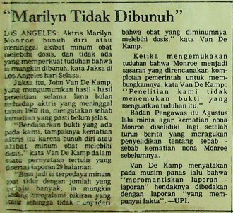 Aktris Marilyn Monroe diduga bunuh diri atau meninggal akibat minum obat melebihi dosis. Tidak ada tuduhan yang memperkuat bahwa ada kemungkinan ia dibunuh. Walaupun begitu, Jhon Van De Kamp selaku jaksa mengatakan sebab kematian yang belum jelas.
