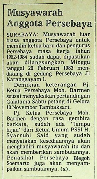 Musyawarah luar biasa anggota Persebaya untuk memilih ketua baru dan pengurus Persebaya masa kerja tahun 1982-1984 dipastikan berlangsung pada tanggal 20 Februari 1983 di gedung Persebaya Jl. Karanggayam 1