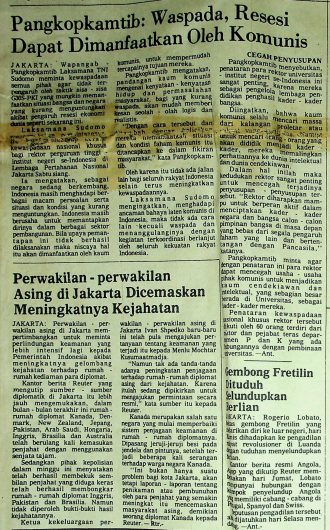 Wapangab-Pangkopkamtib Laksamana TNI Sudorno meminta kewaspadaan semua pihak agar tidak terpengaruh oleh taktik sisa-sisa G30S-PKI yang mungkin memanfaatkan situasi bangsa dan negara yang kurang menguntungkan akibat pengaruh resesi ekonomi dunia