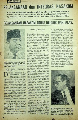 Bung Karno sebagai bapak pemersatu ketiga unsur kekuatan Revolusi Indonesia, yakni NASAKOM (Nas untuk Nasionalis, A untuk Agama, KOM untuk Komunis). Pelaksanaan dan integrasi NASAKOM tidak langsung berjalan dengan lancar. Bung Karno mengatakan bahwa hingga kini masih saja ada golongan yang belum dapat menerima NASAKOM karena mereka masih komunisto phobie.
