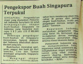 Pegendalian impor yang dijalankan pemerintah Indonesia baru-baru ini telah mempengaruhi ekspor buah-buahan Singapura ke Indonesia yang biasanya mencapai $2 juta (US $ 950.000) sebulan. Beberapa pengekspor buah-buahan di Singapura menyatakan, banyak pesanan dari Indonesia dibatalkan.