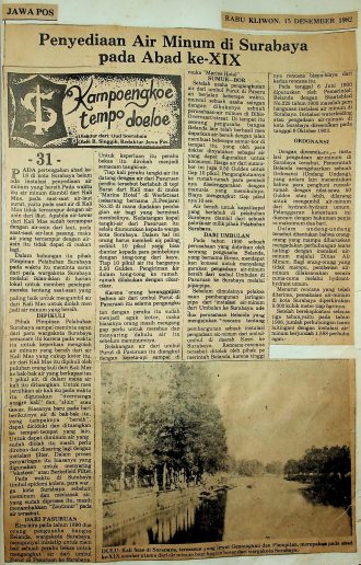 Penyediaan air minum di Surabaya baru dimulai tahun 1890. Salah seorang pengusaha Belanda mendapat konsesi untuk pengadaan pipa-pipa air minum yang disalurkan dari Pasuruan.