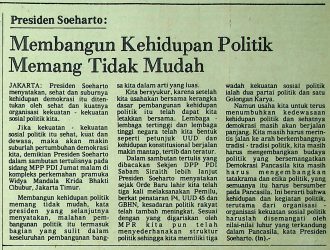 Sidang MPP PDI di kompleks perkemahan pramuka Widya Mandala Krida Bhakti Cibubur Presiden Soeharto mengatakan bahwa sehat dan suburnya kehidupan demokrasi itu ditentukan oleh sehat dan kuatnya organisasi kekuatan-kekuatan sosial politik Indonesia