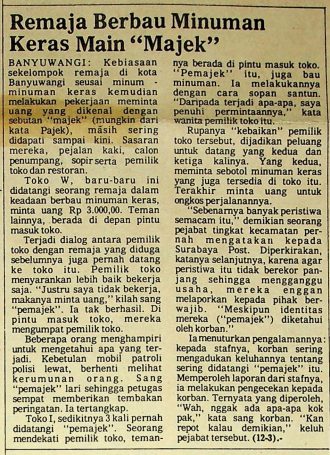 Kebiasaan sekelompok remaja di kota Banyuwangi seusai minum-minuman keras kemudian melakukan pekerjaan meminta uang yang dikenal dengan sebutan “majek” (mungkin dari kata pajek) sering dijumpai pada tahun 1983. Sasaran mereka adalah pejalan kaki, calon penumpang, sopir serta pemilik toko dan restoran.