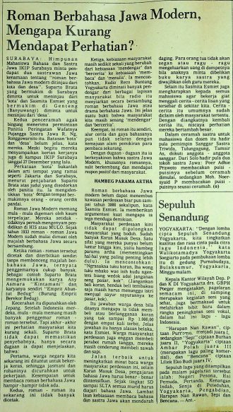 Himpunan Mahasiswa Bahasa dan Sastra Jawa IKIP Surabaya minta pendapat dua sastrawan Jawa kenamaan tentang “roman berbahasa Jawa modern ditinjau dari kota dan desa”, Suparto Brata yang bermukim di Surabaya diminta untuk meninjau dari ‘kota’ dan Sasmita Esmiet yang bermukinj di Genteng (Banyuwangi) dimintai untuk meninjau daru “desa”