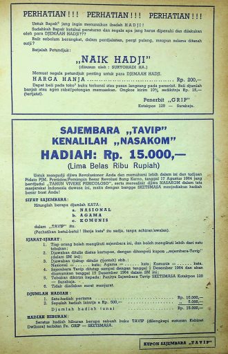 Untuk menguji jiwa revolusioner diadakan sayembara mengenai pembahasan NASAKOM dengan total hadiah Rp. 15.000,- rinciannya juara pertama Rp. 10.000,- dan sepuluh hadiah lainnya @Rp. 500 = Rp. 5.000,-