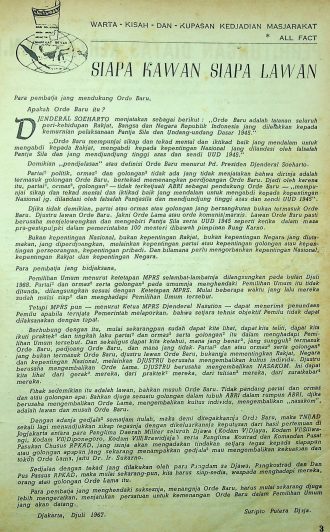 Tidak memandang partai maupun golongan, apabila ia berusaha mengembalikan pemerintahan orde lama, kultus individu, dan mengembalikan ajaran nasakom maka itu merupakan lawan dan musuh dari orde baru.