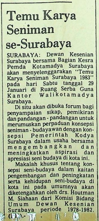 Dewan Kesenian Surabaya bersama Bagian Kesra Pemda Kotamadya Surabaya menyelenggarakan “Temu Karya Seniman Surabaya 1983” pada Sabtu, 29 Januari 1983 di Ruang Serba Guna Kantor Walikotamadya.